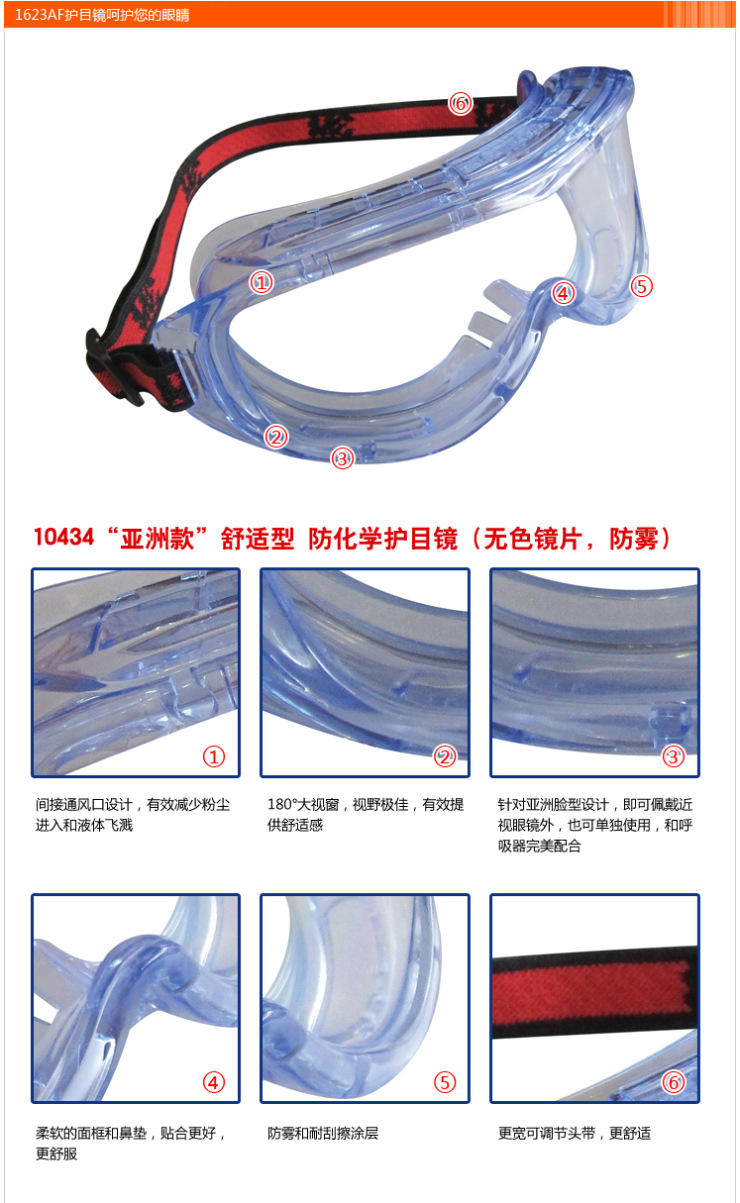 3M官方 1623AF亚洲款舒适型防雾防化学护目镜 10副/箱(含税)