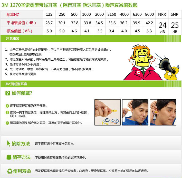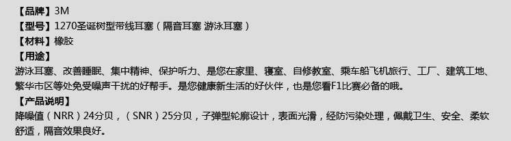 3M 1270圣诞树型带线500个/箱 耳塞 防噪音耳塞 硅胶耳塞(含税)
